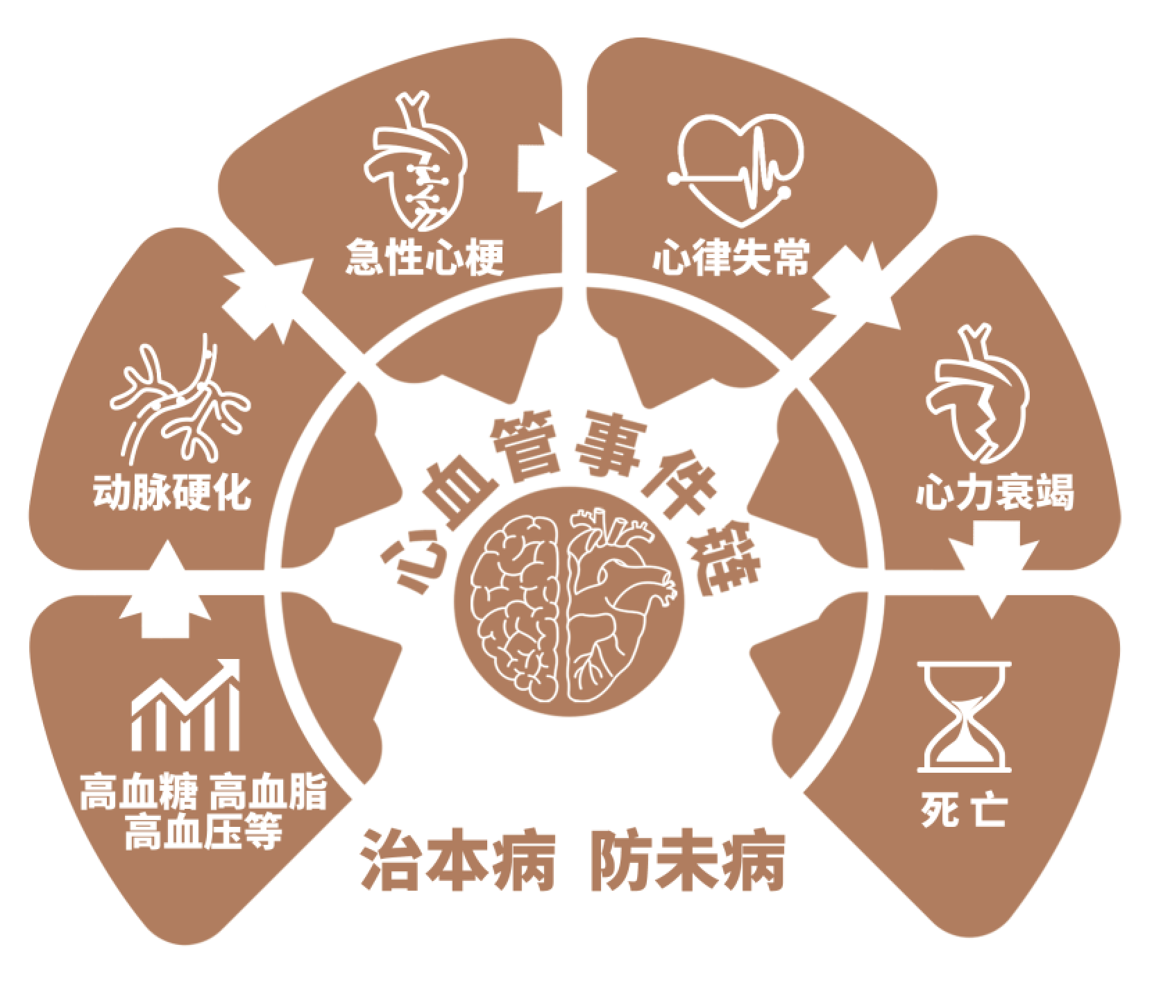 心血管疾病并非一蹴而就,而是沿着一条清晰的发展路径逐步发生、发展、恶化,这条路径被称为“心血管事件链”。这个链条始于代谢综合征,如高血糖、高血压、高血脂等危险因素,这些因素导致血管内皮损伤和动脉粥样硬化斑块形成,斑块破裂后引发血栓,进而导致心肌梗死、心律失常等急性事件,最终发展为心力衰竭。这一链条,呈现出多因素、多环节相互作用下因果相连、递进发展、事件突发、后果严重的复杂、连续病变特点,每个环节都可能成为健康的“关键转折点”。